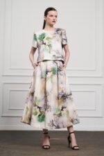 Begeistern Sie alle um sich herum mit diesem eleganten Zweiteiler in zarten Aquarelltönen. Leicht fließende Blumenmotive in Kombination mit einer schwarzen Schleife verleihen jedem Schritt eine besondere Eleganz und Weiblichkeit.
