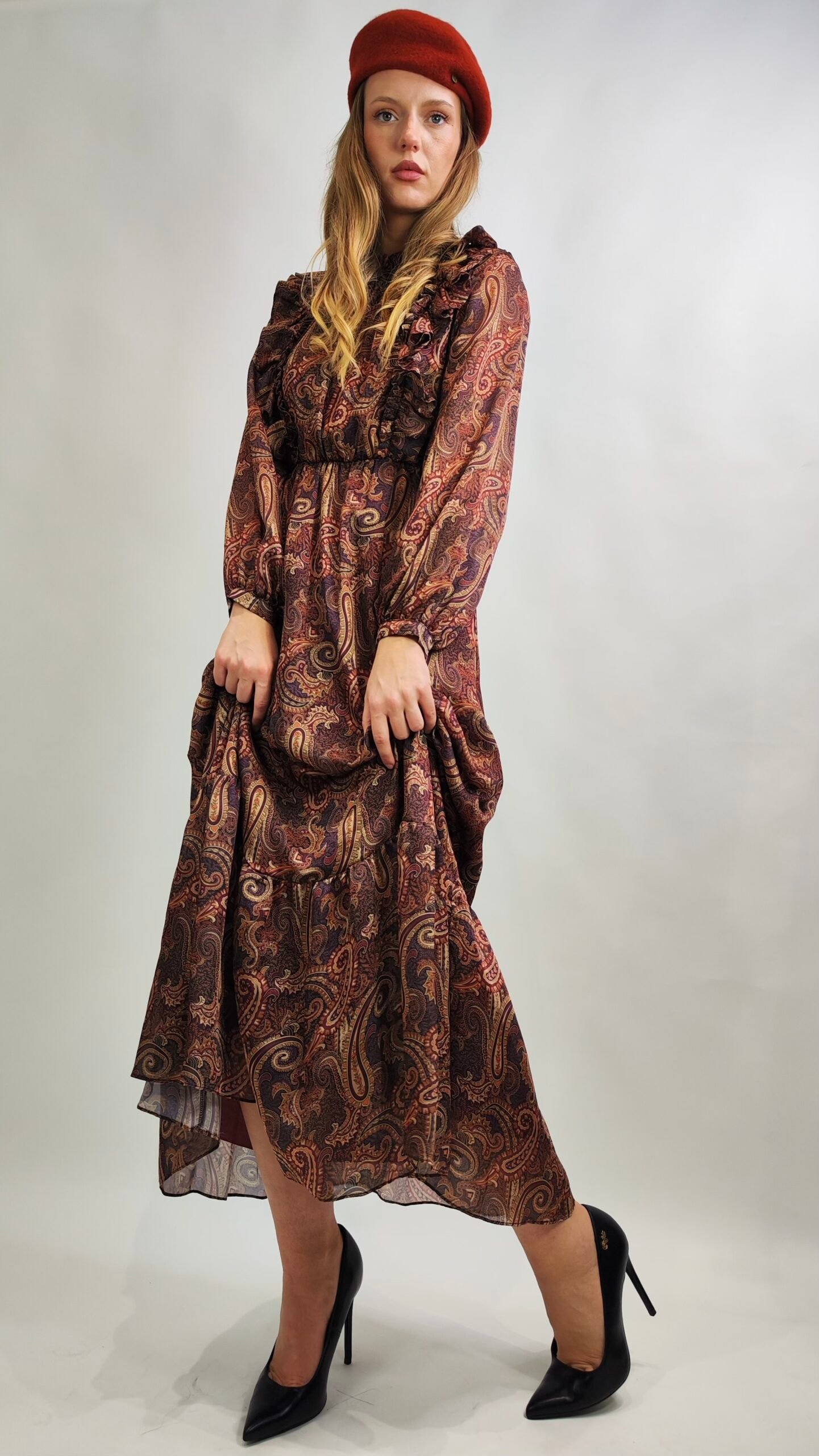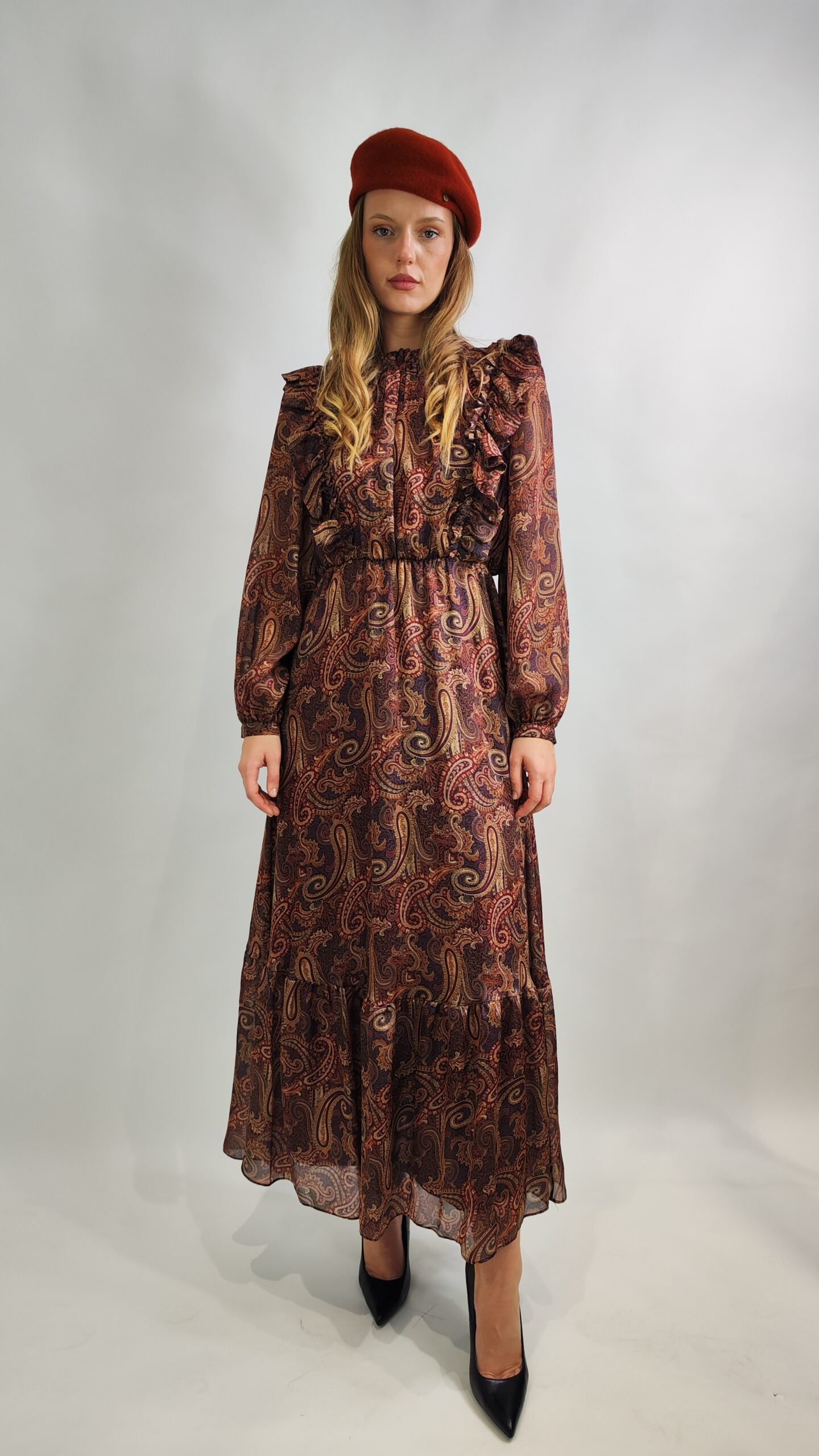 Hochwertiges Midikleid im Paisley-Design mit raffinierten Rüschen und weich fließender Silhouette.