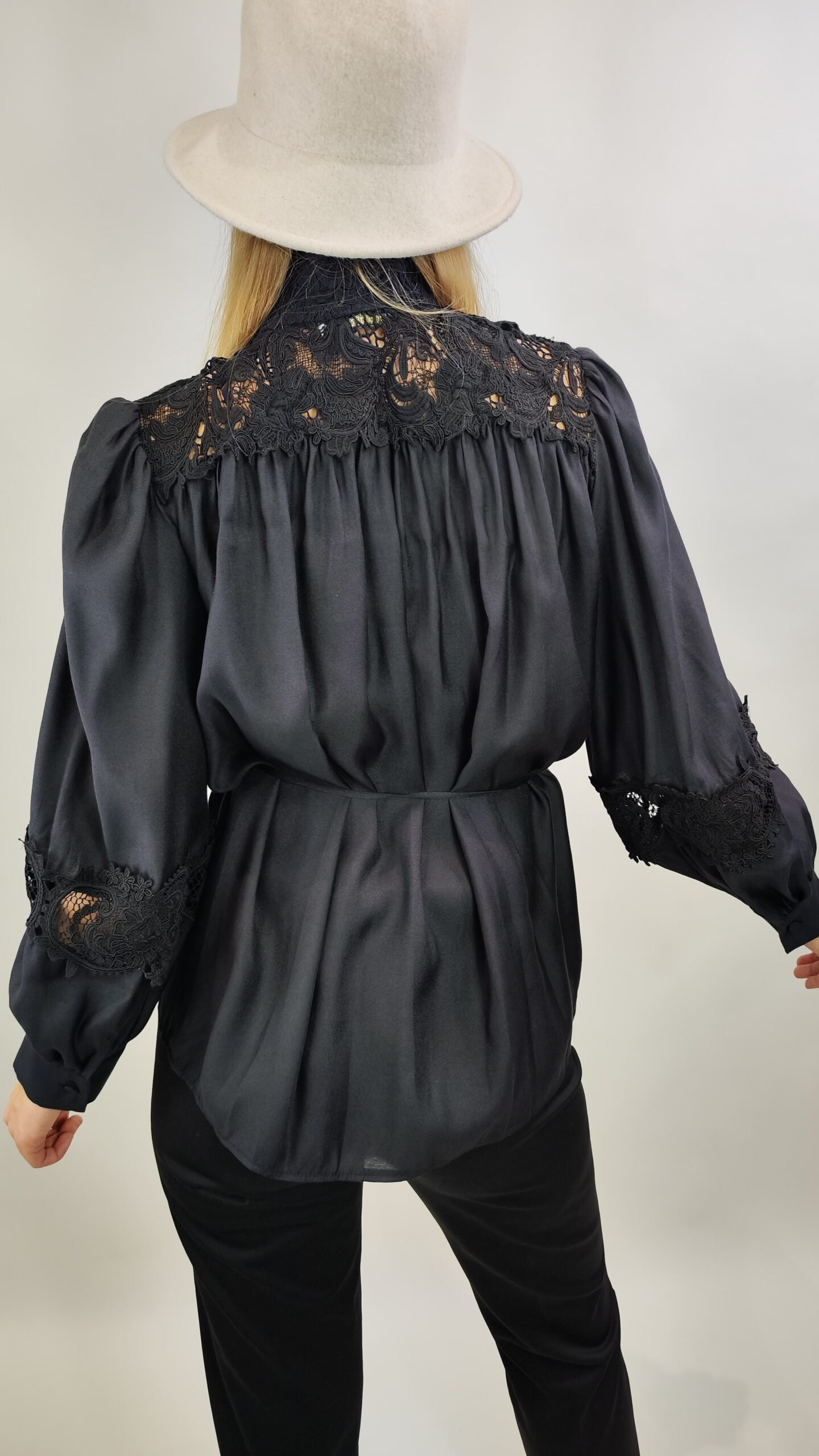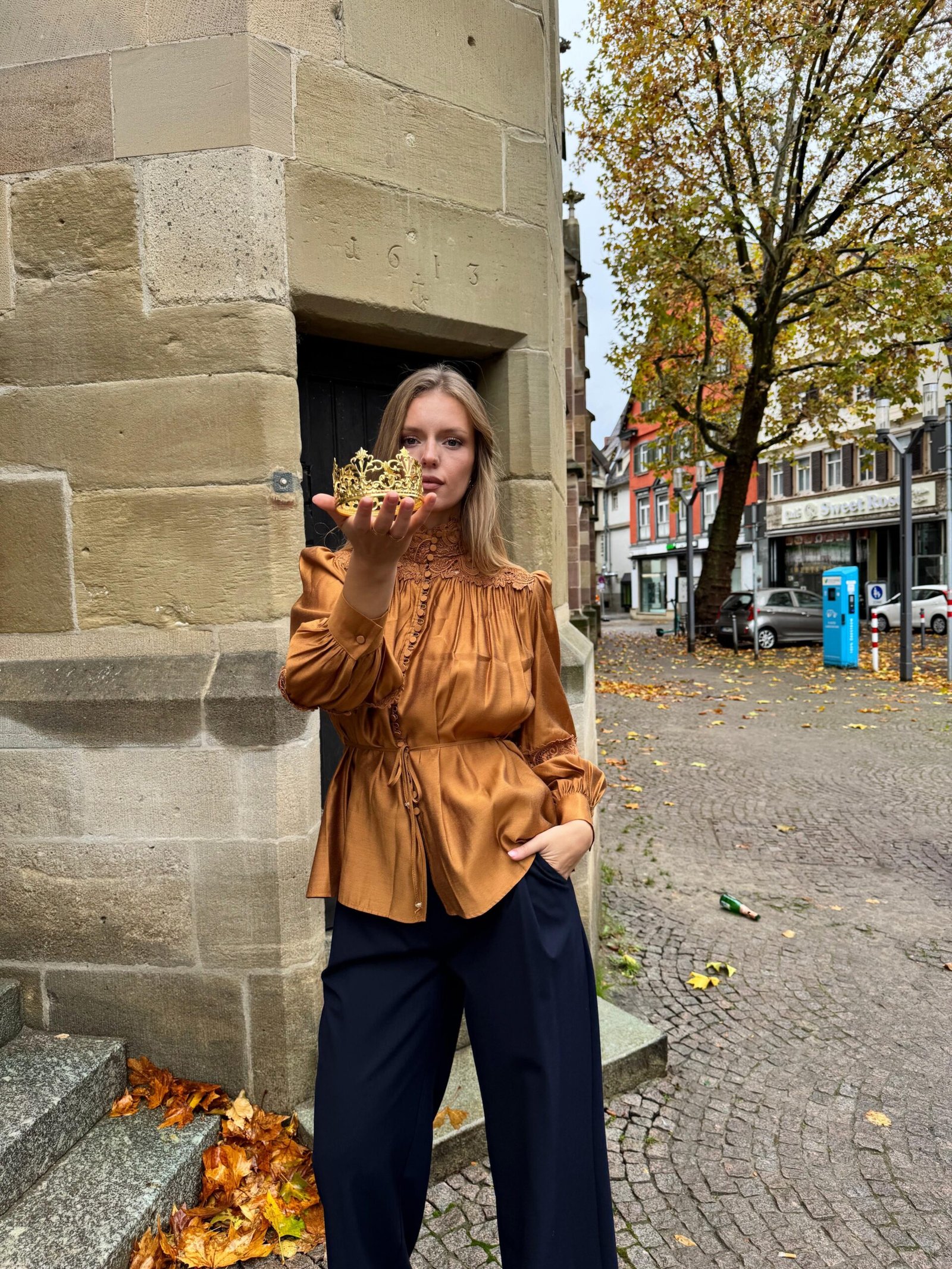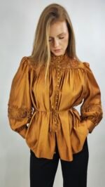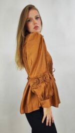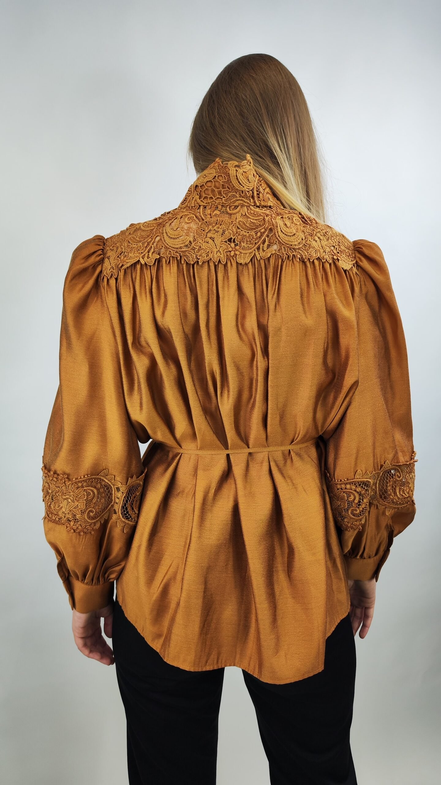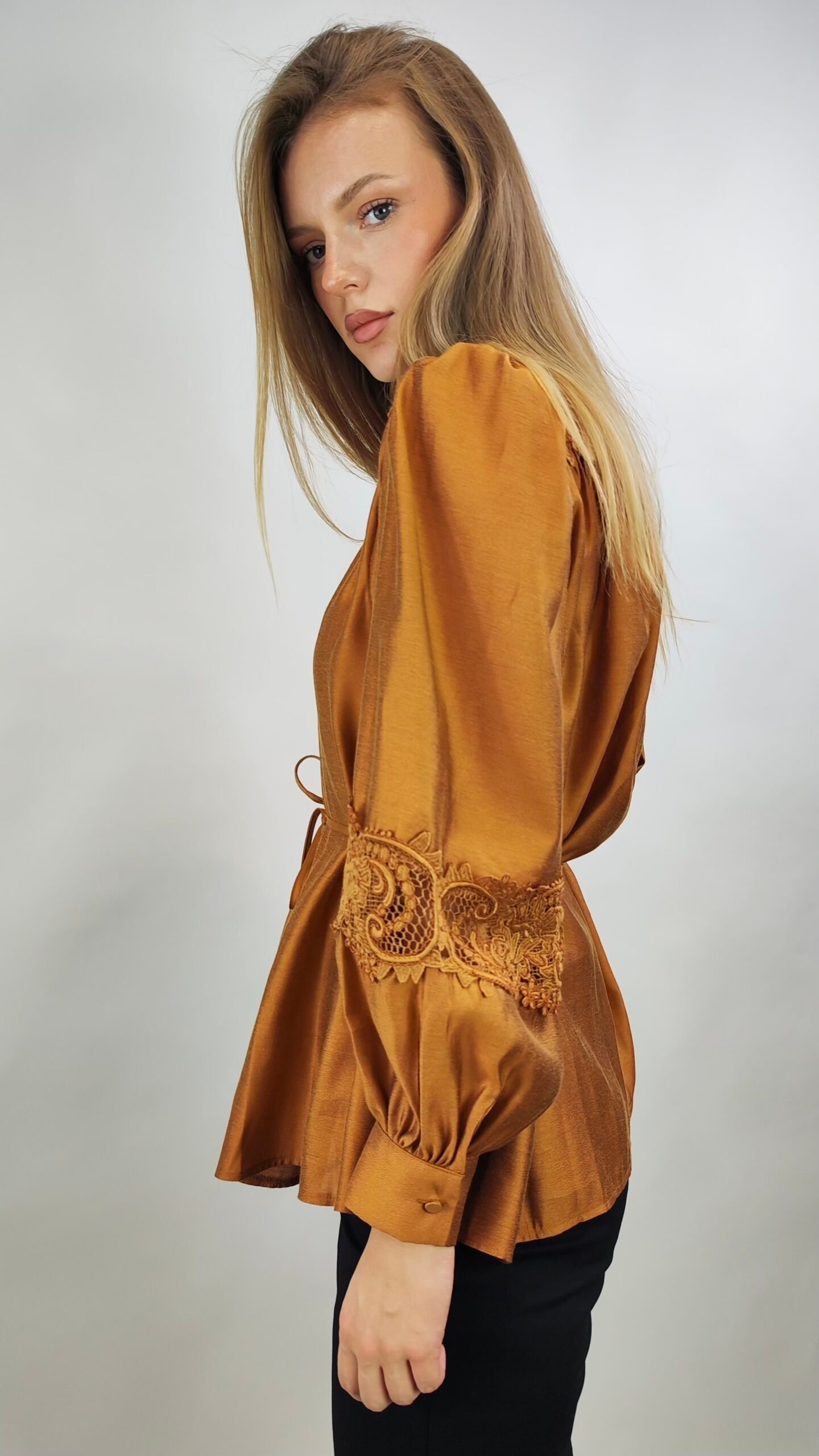 Elegante Damenbluse in edlem Kupferton, verziert mit feiner Spitze am Kragen und an den Ärmeln. Mit Bindegürtel für eine feminine Silhouette – perfekt für besondere Anlässe oder stilvolle Alltagslooks.