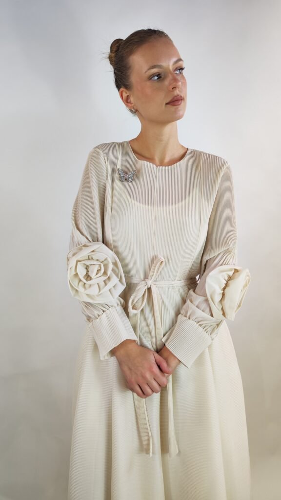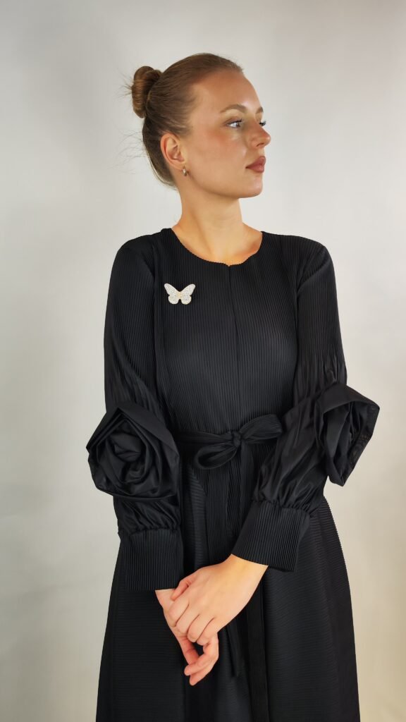 Elegantes Plissé-Kleid mit Gürtel und Rosendetail