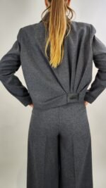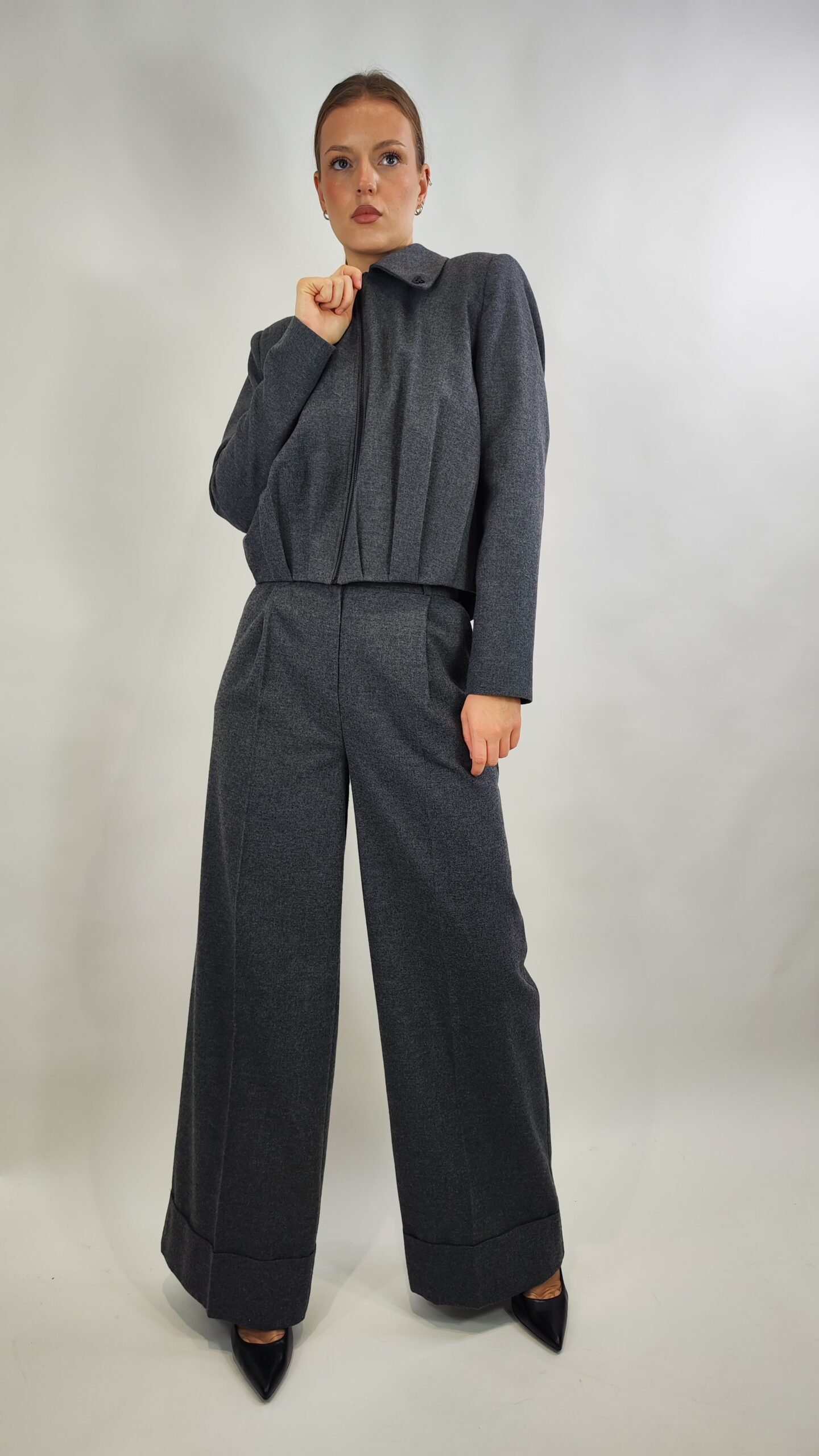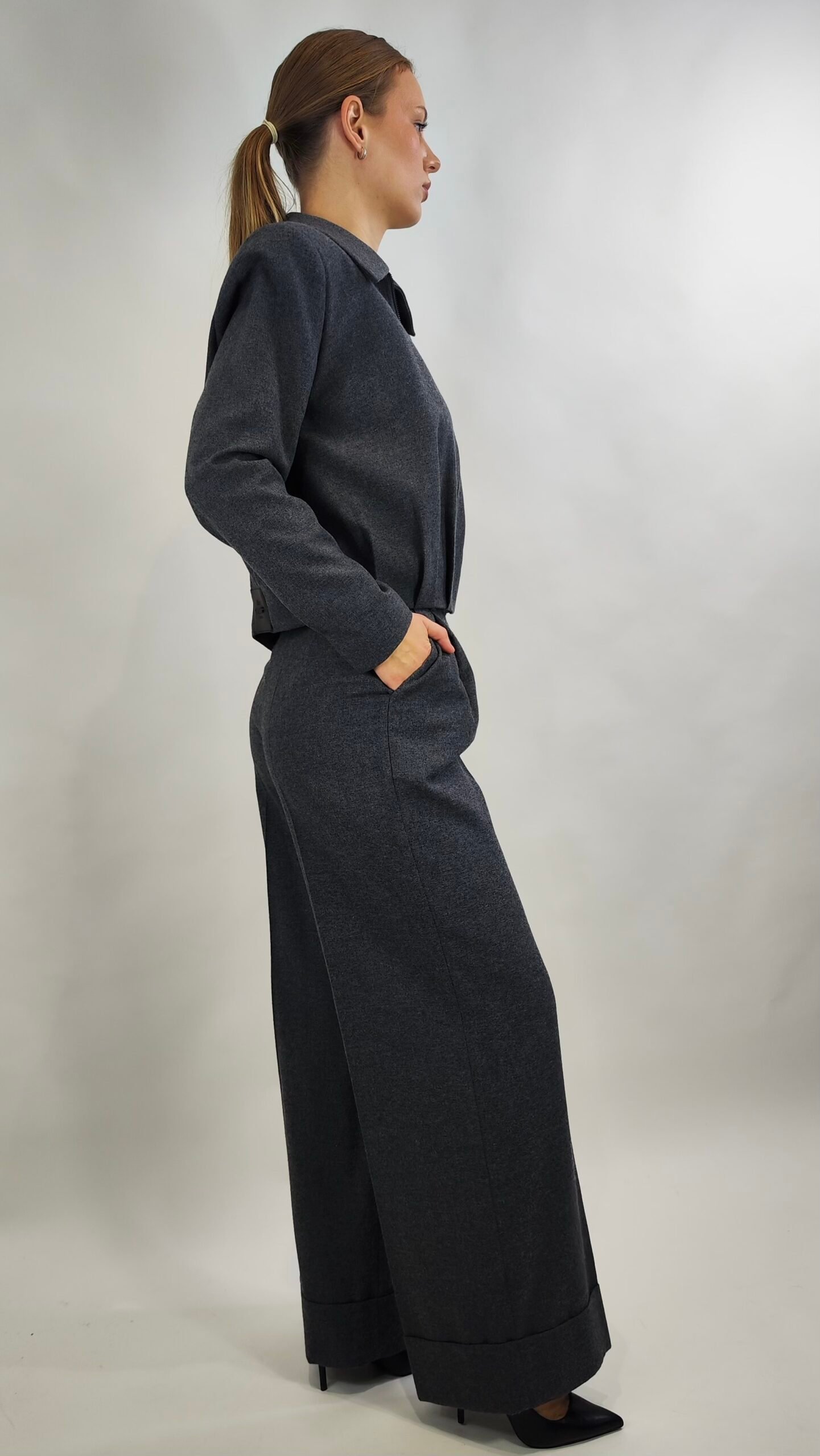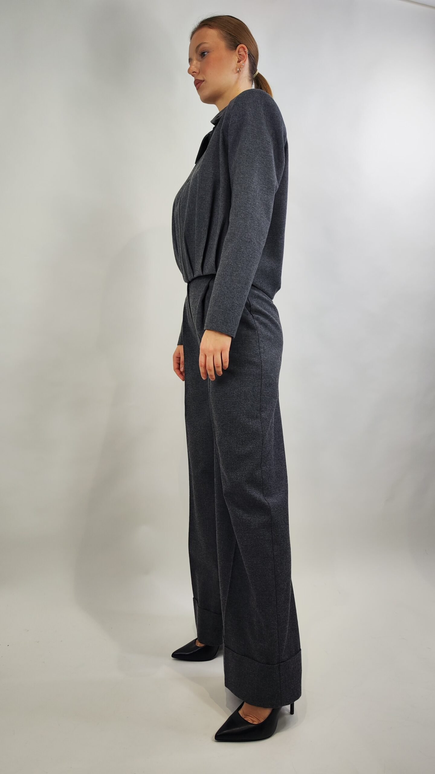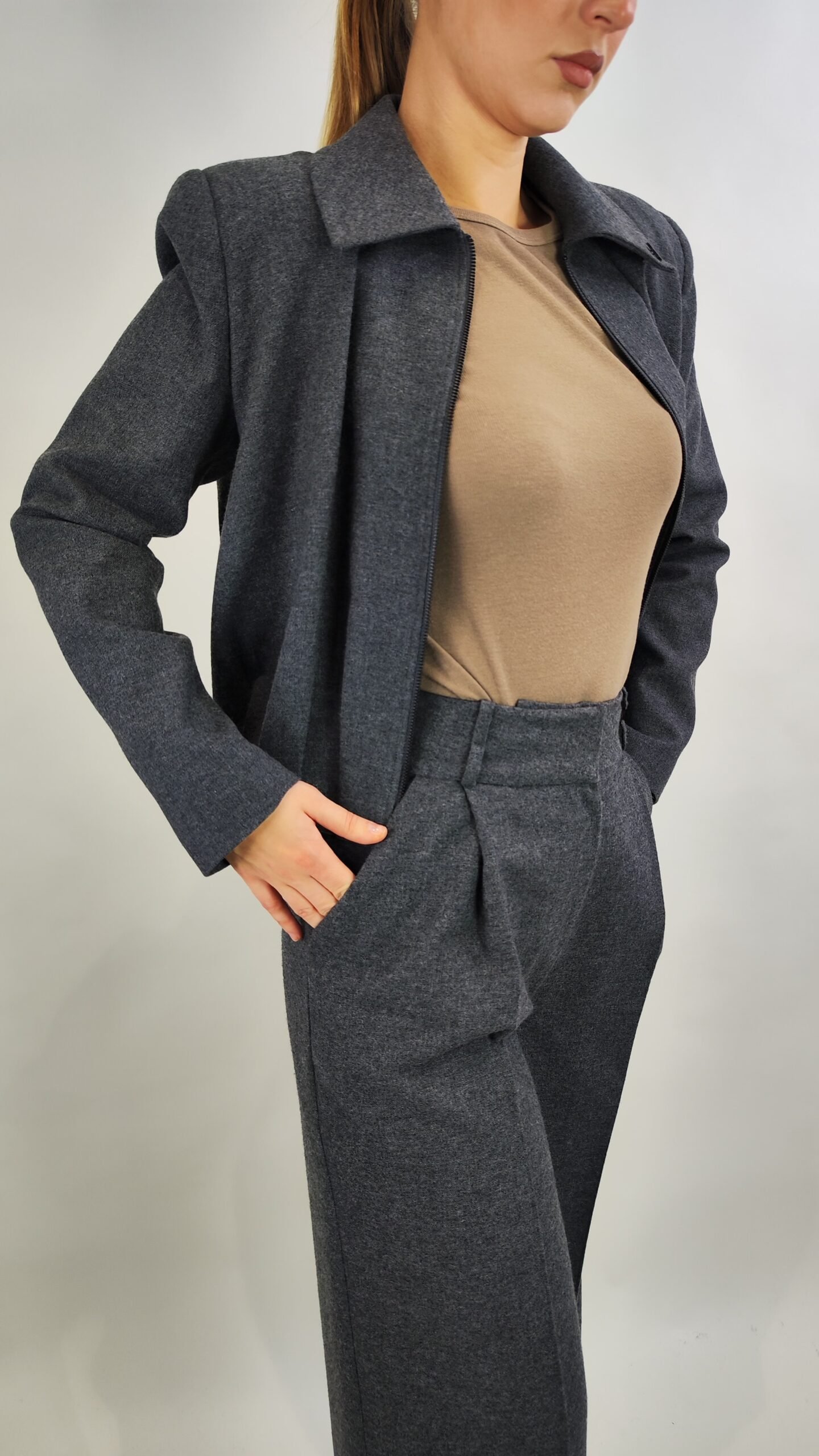 Moderner und bequemer Damen-Zweiteiler in elegantem Grau, bestehend aus einer locker geschnittenen Jacke und einer weit fallenden Hose. Perfekt für stilvolle Alltagslooks, Büro-Outfits oder entspannte Wochenendkombinationen.