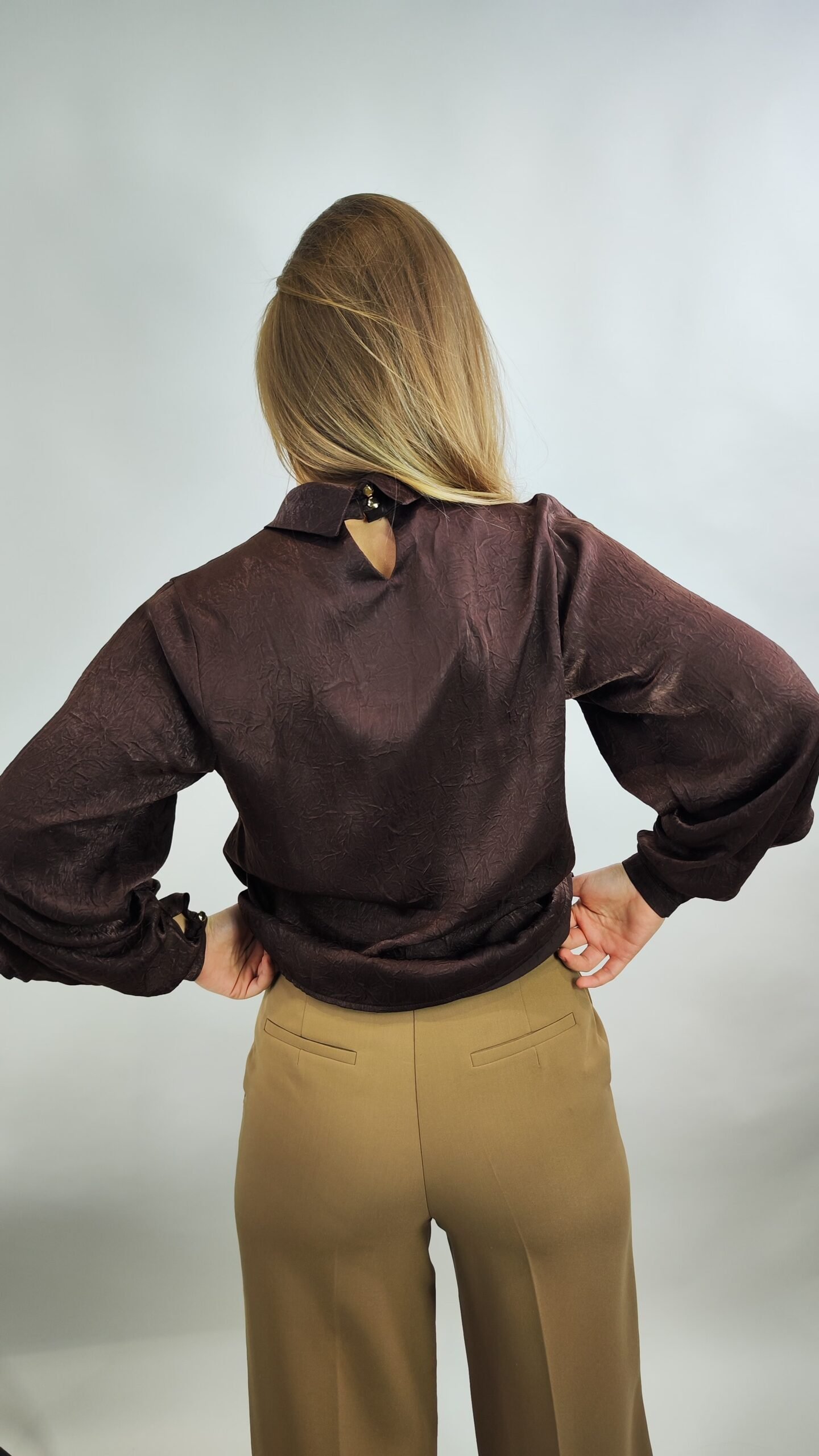 Edle dunkelbraune Bluse mit feiner Crinkle-Struktur und voluminösen Ärmeln – ein stilvolles, modernes Basic für vielseitige Outfits.