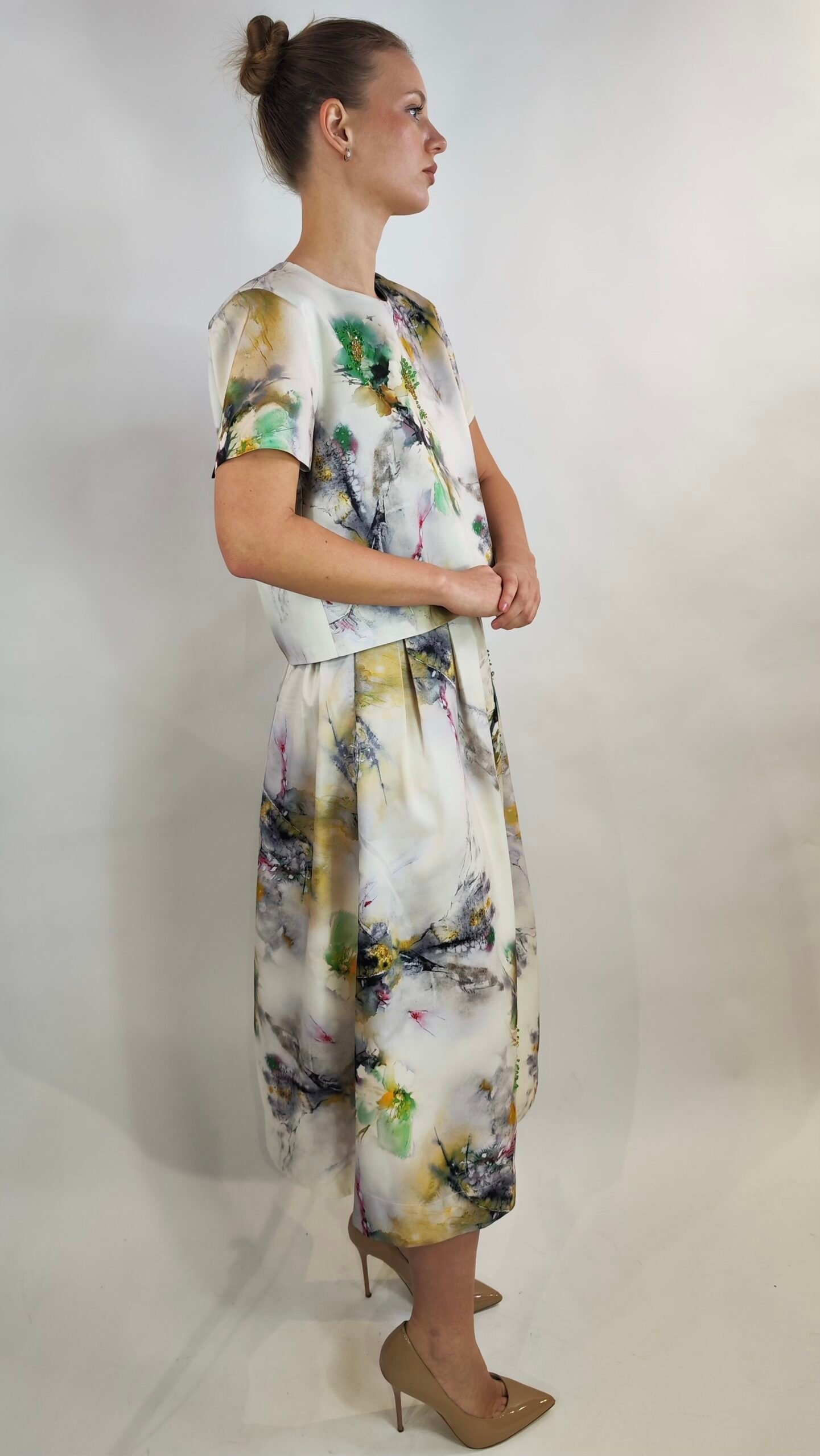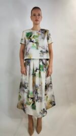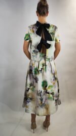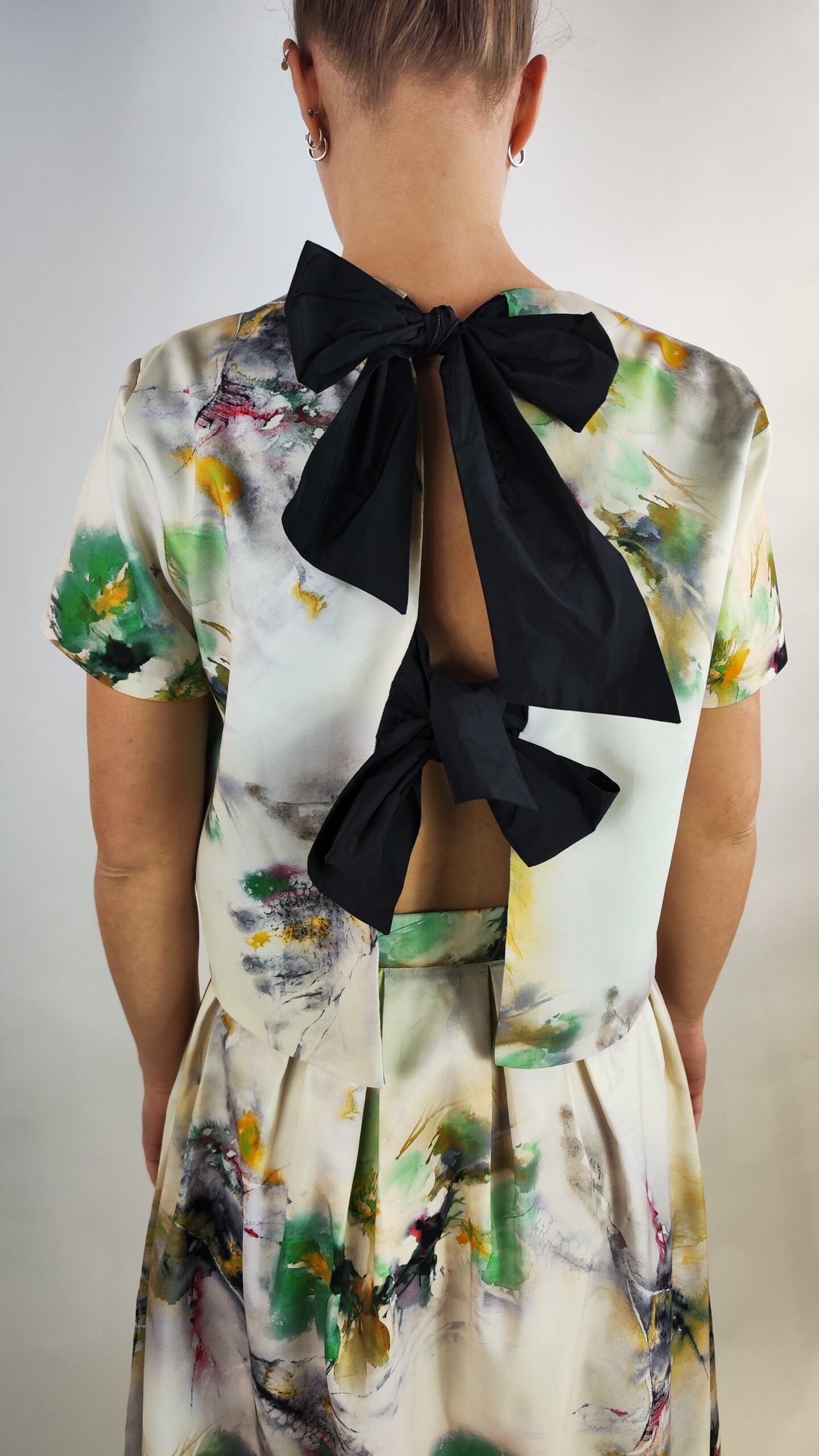 Exklusiver zweiteiliger Damen-Set bestehend aus kurzem Oberteil und Midirock mit kunstvollem Print und dekorativen Schleifen am Rücken. Feminin, modern und ideal für besondere Anlässe.
