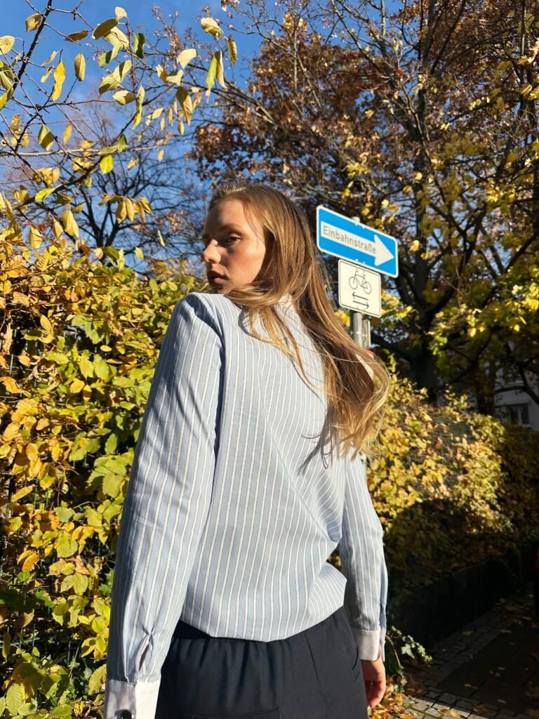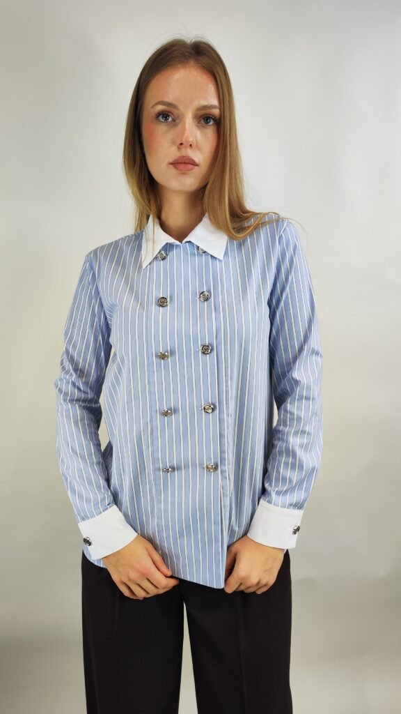 Gestreifte Damenbluse mit Kontrastkragen und doppelter Knopfleiste