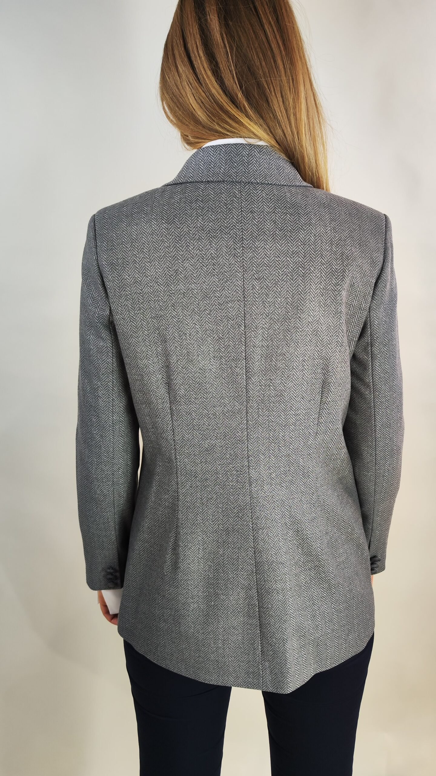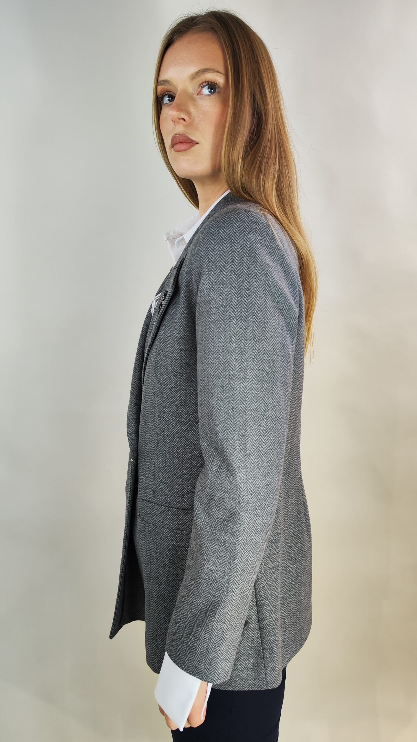 Klassischer grauer Blazer mit feinem Fischgrätmuster. Die strukturierte Silhouette, das Revers und die dezenten Knöpfe verleihen dem Modell einen eleganten, zeitlosen Look.