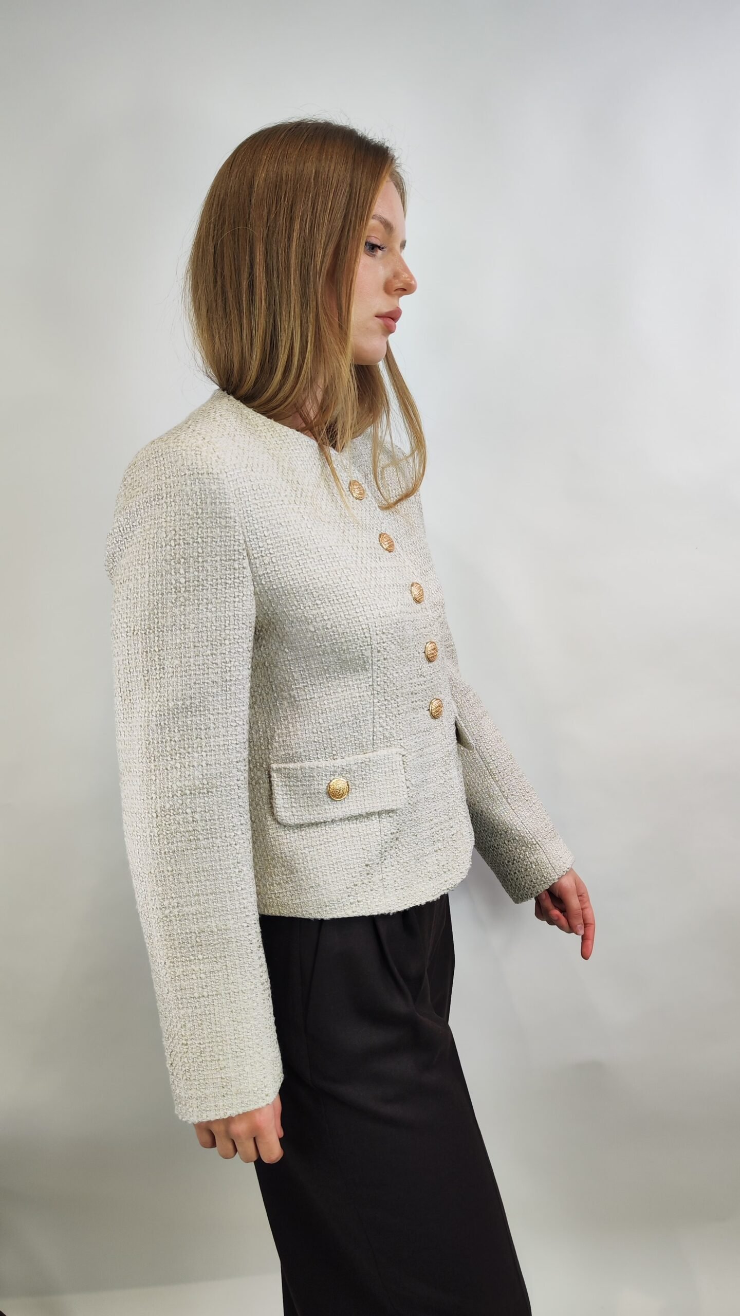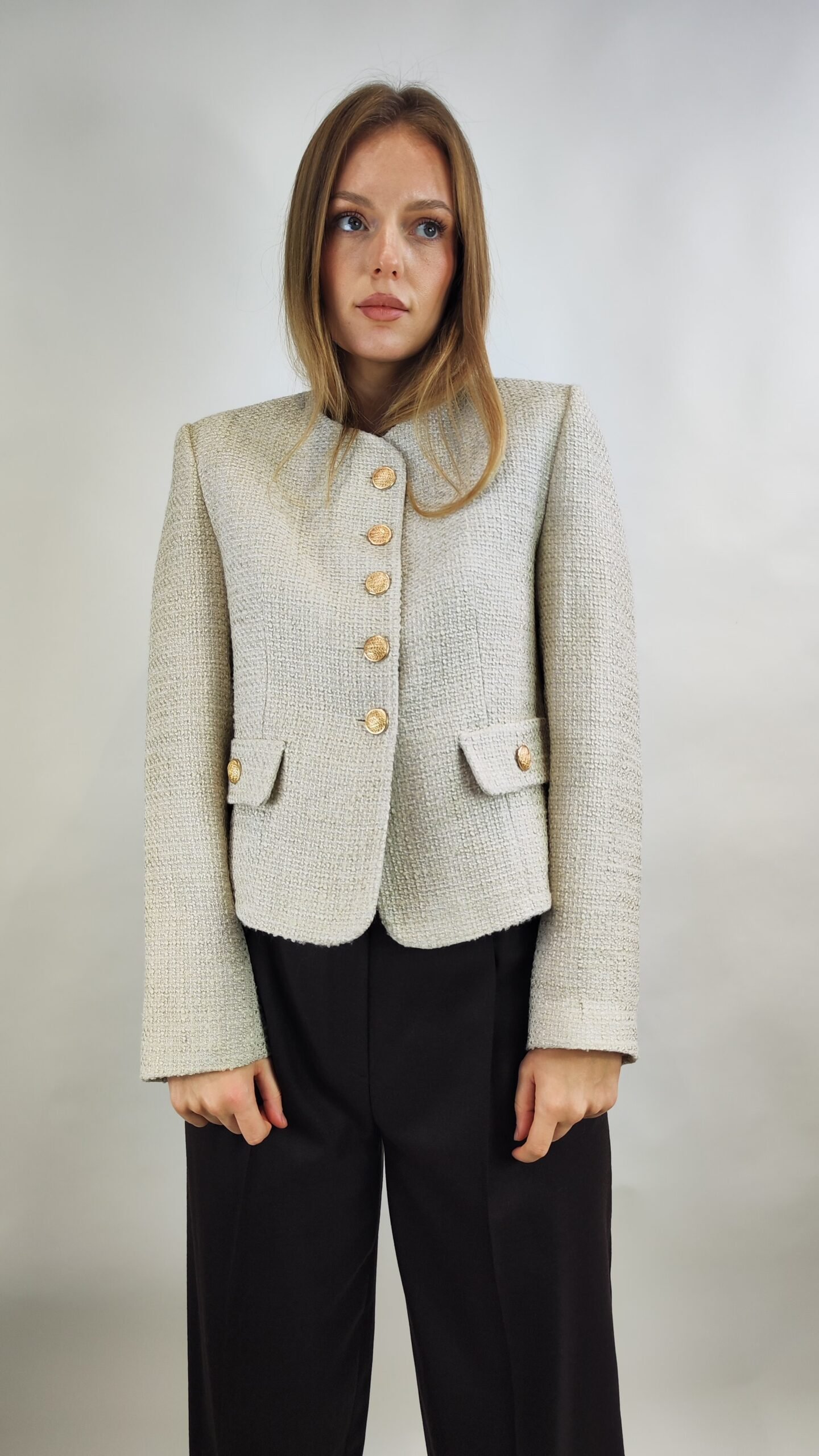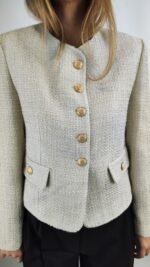 Startseite » Shop » Eleganter Tweed-Blazer in Creme mit Goldknöpfen