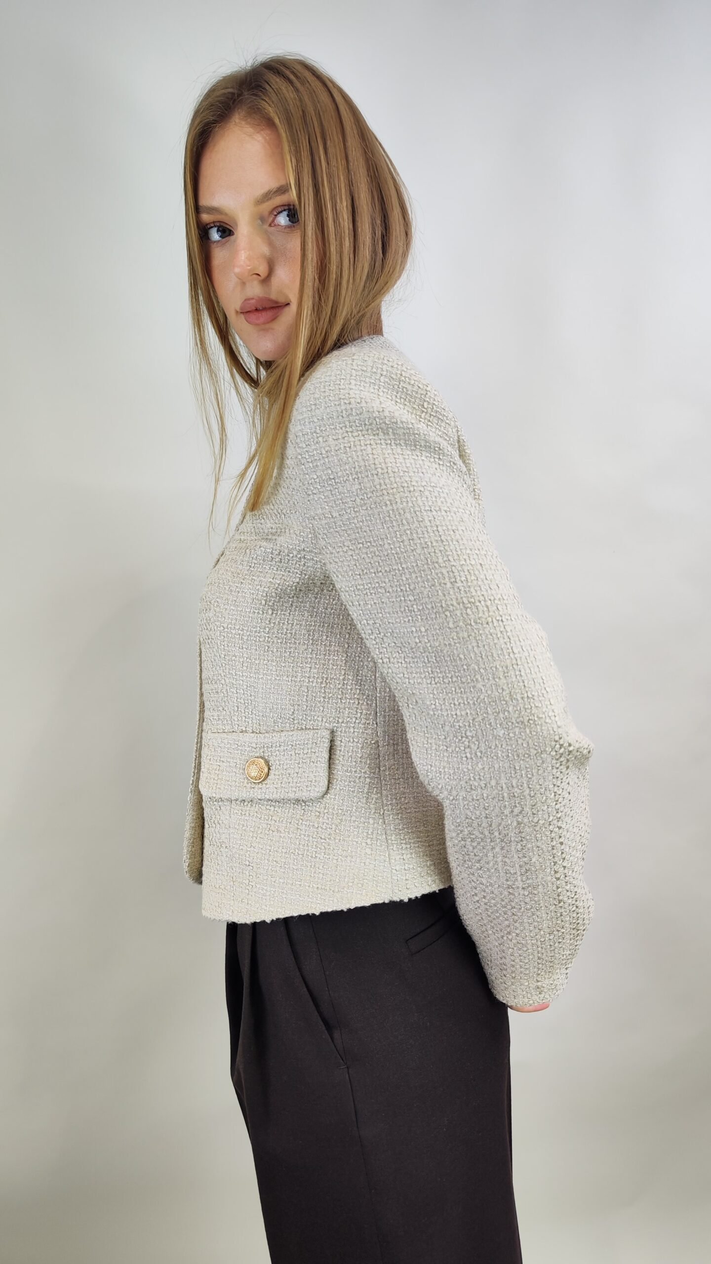 Hochwertiger cremefarbener Tweed-Blazer aus 100% Baumwolle mit dekorativen Goldknöpfen und zeitlosem, femininen Schnitt – perfekt für elegante und moderne Looks.