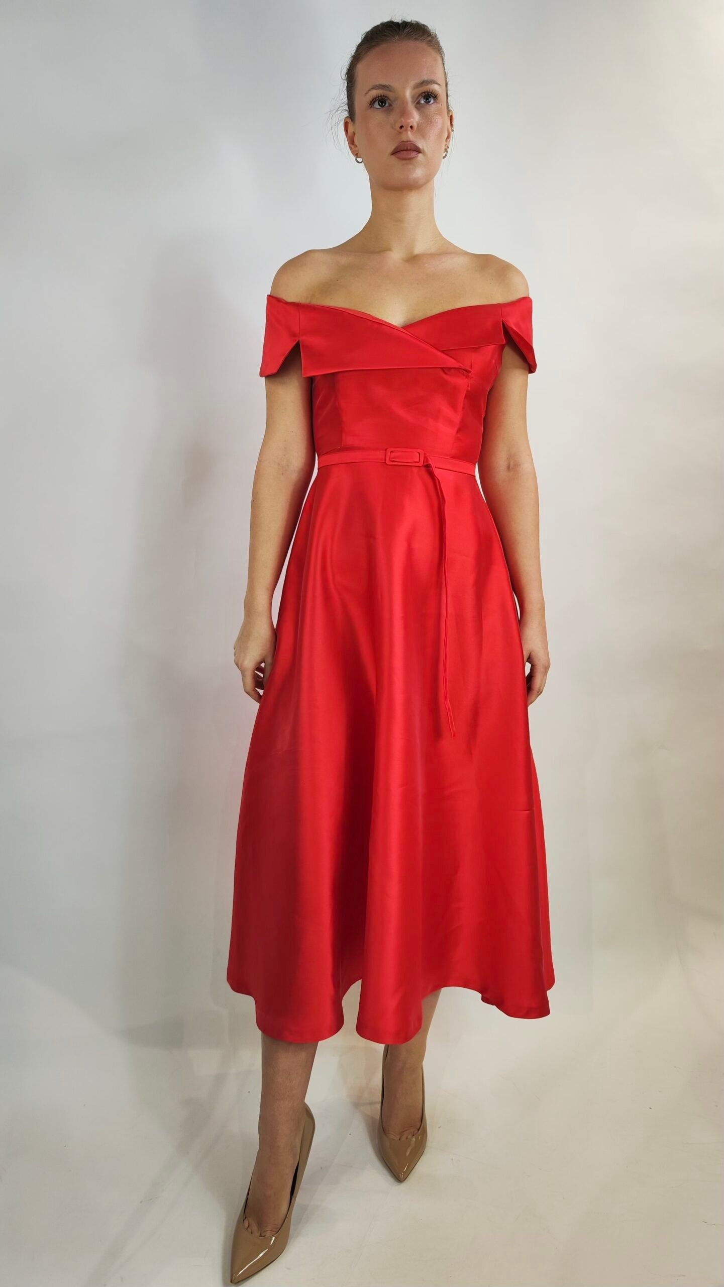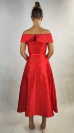 Feminin-elegantes Midikleid in leuchtendem Rot mit Off-Shoulder-Ausschnitt und Taillengürtel. Perfekt für festliche Anlässe und besondere Auftritte.