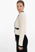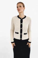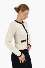 Elegantni kardigan krem boje izrađen od visokokvalitetne pletenine s kontrastnim crnim obrubom i zlatnim gumbima. Pripijeni kroj za moderan poslovni i svakodnevni izgled.