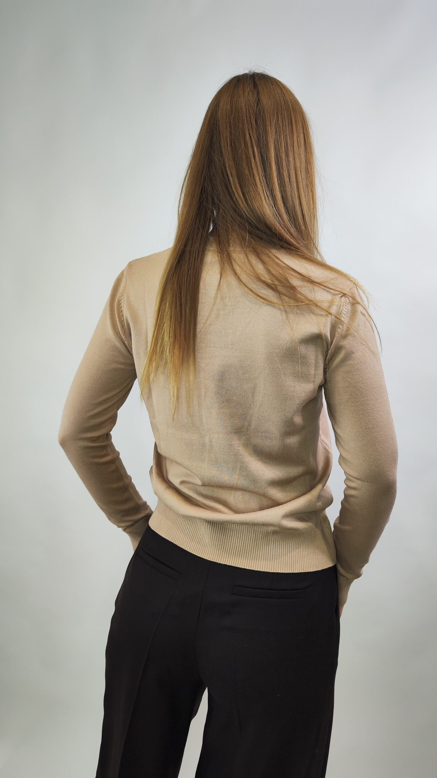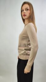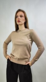Eleganter Feinstrick-Pullover in warmem Beige mit klassischem Rundhalsausschnitt und dezentem goldfarbenem Logo – weich, zeitlos und vielseitig kombinierbar.