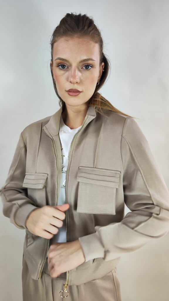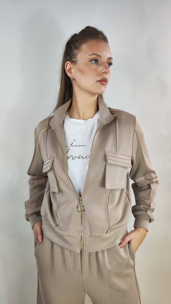 Beiges Damen-Loungewear-Set aus Modal-Mix mit Zip-Jacke und Wide-Leg-Hose