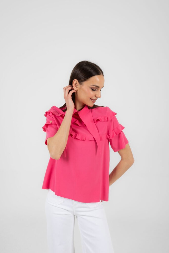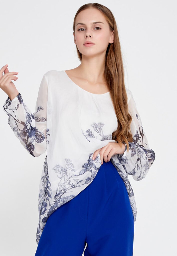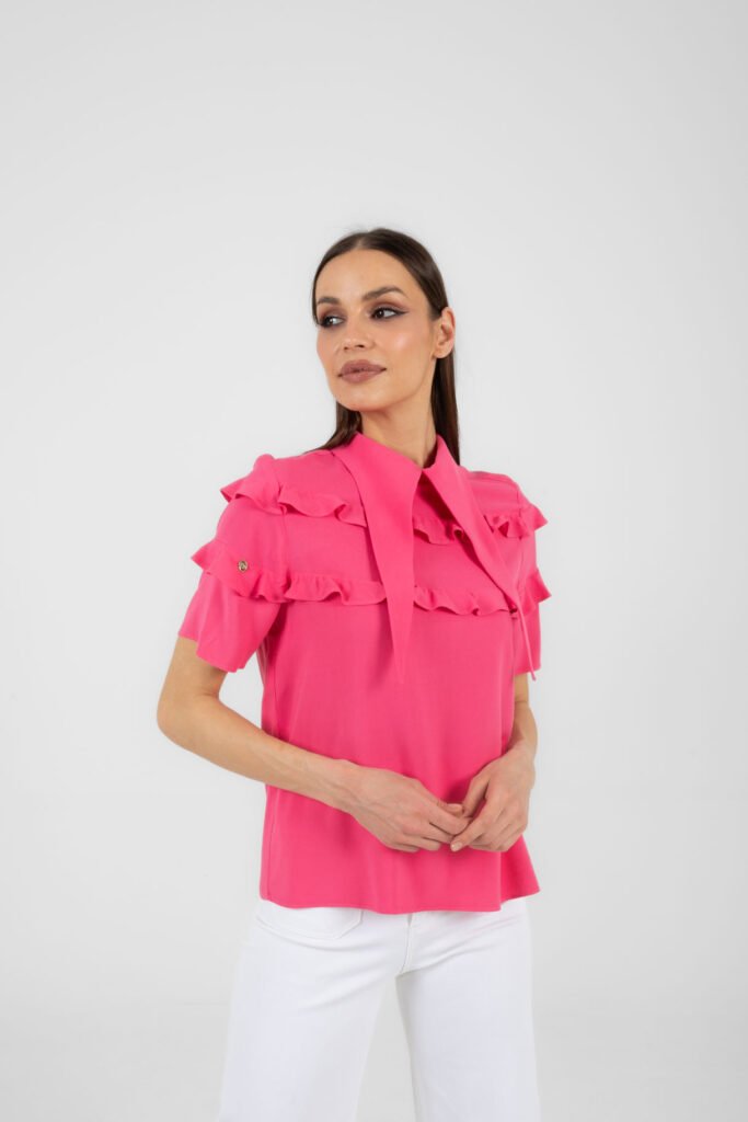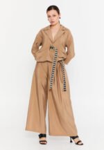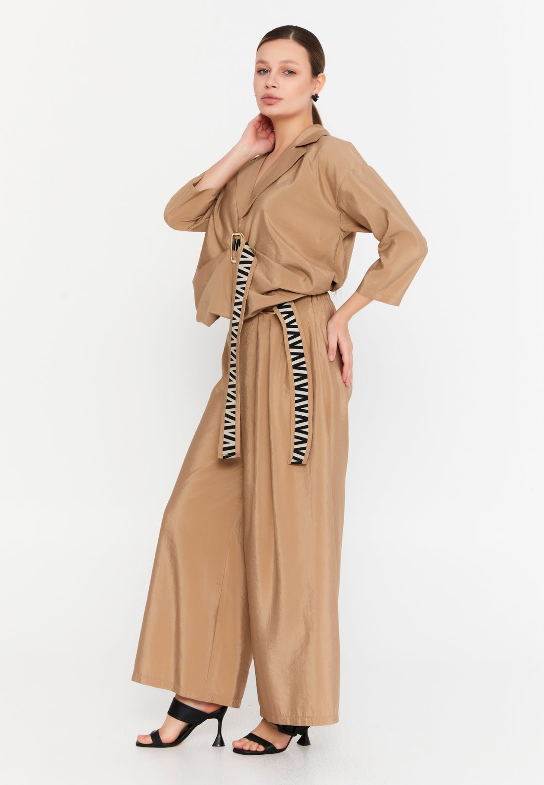 Eine lässige Jacke mit Revers, 3/4-Ärmeln und einem Gürtel mit auffälligem Schwarz-Weiß-Print und Metallschnalle – ein Accessoire, das die Taille betont und einen modernen Kontrast setzt. Dazu eine weite, gerade Hose mit elastischem Bund hinten aus leichtem, bequemem Stoff, der jeder Bewegung folgt.